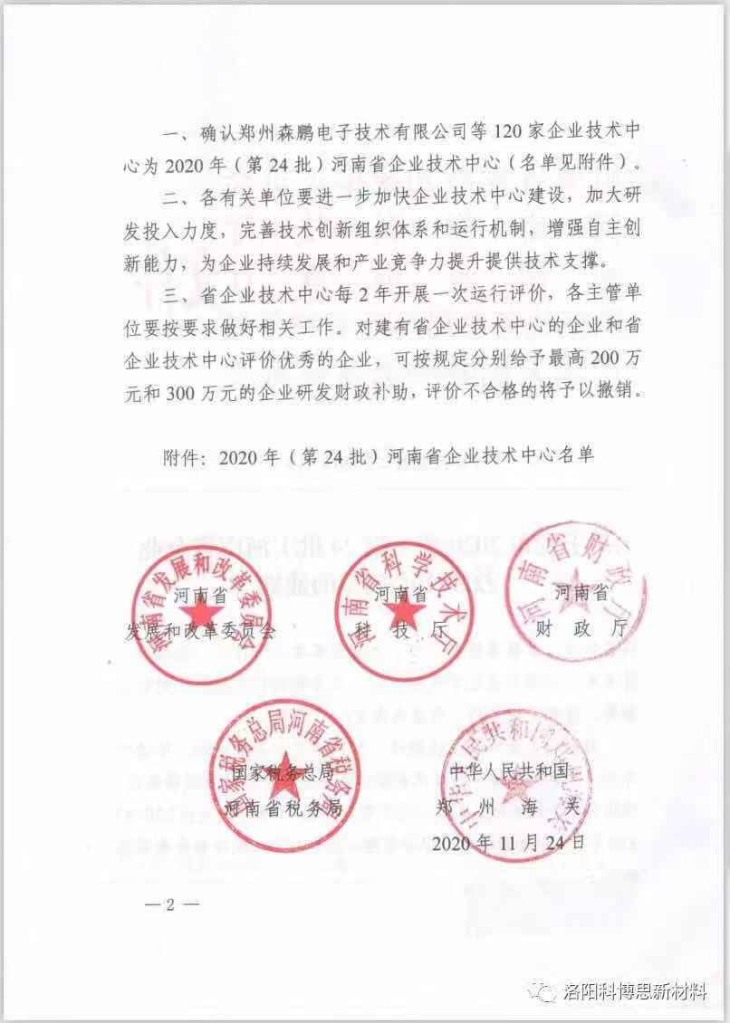 近日,河南省發(fā)展和改革委員會(huì)下發(fā)了《關(guān)于發(fā)布2020年(第24批)河南省企業(yè)技術(shù)中心名單的通知》(豫發(fā)改高技〔2020〕919號(hào)),經(jīng)過評(píng)審、考察、公示等環(huán)節(jié),洛陽科博思新材料科技有限公司從全省多家企業(yè)脫穎而出,順利通過第24批省級(jí)企業(yè)技術(shù)中心認(rèn)定,這是公司在2018年被認(rèn)定為洛陽市企業(yè)技術(shù)中心后的又一突破。